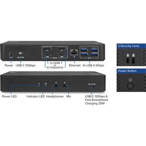 - Extra functies: 4 USB-A poorten (5Gbps), Gigabit LAN poort, microfoon- en hoofdtelefoonaansluitingen, aan/uit-knop en een uitsparing voor beveiligingssloten