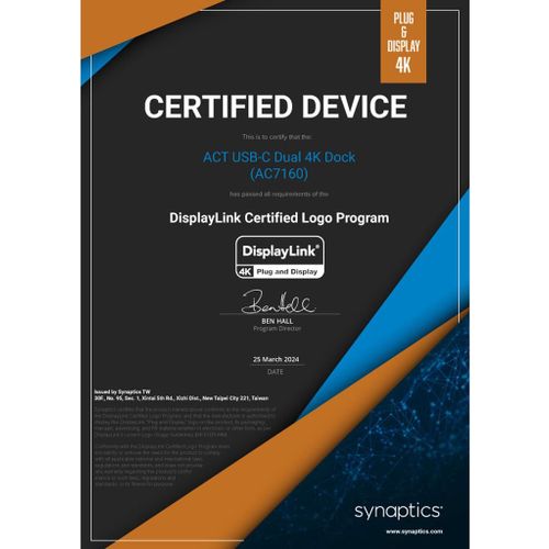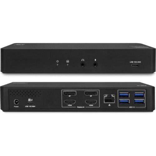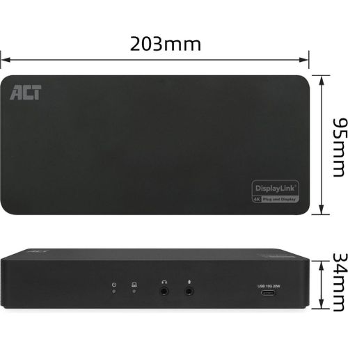 Het AC7160 4K Docking Station verandert je Windows-laptop of MacBook in een compleet werkstation door het aansluiten van één USB-C-kabel. Sluit tot twee extra 4K-schermen aan voor een uitgebreide beeldschermweergave op zowel Windows als Apple laptops dankzij de ingebouwde DisplayLink®-technologie. Het docking station is uitgerust met een Gigabit LAN-poort, 1 USB-C-poort (10Gbps / 20W snel laden), 4 USB-A-poorten (5Gbps), een microfoon- en hoofdtelefoonpoort. Het docking station wordt geleverd met een 135W poweradapter. Deze adapter voorziet het docking station van stroom en levert ook tot 96W om de aangesloten laptop op te laden. Het ACT USB-C Docking Station voldoet aan alle voorwaarden van het DisplayLink Certified Logo Program. De twee extra 4K-monitoren en het beeldscherm van je laptop breiden je werkruimte uit tot een totaal van drie beeldschermen voor een optimale productiviteit. Verander je Windows-laptop of MacBook in een compleet werkstation met één USB-C-kabel Dit dockingstation heeft alles wat je nodig hebt om je laptop te veranderen in een compleet werkstation door het aansluiten van een enkele USB-C-kabel op je laptop. Sluit tot twee 4K-monitoren (max. resolutie 4096x2160p @ 60Hz) via de HDMI- of DisplayPort-poorten. Het docking station heeft ook een Gigabit LAN netwerkpoort, microfoon- en hoofdtelefoonaansluitingen. De AC7160 voegt 5 extra USB-poorten toe aan je laptop: vier USB-A-poorten (5Gbps) en één USB-C-poort (10Gbps).