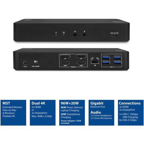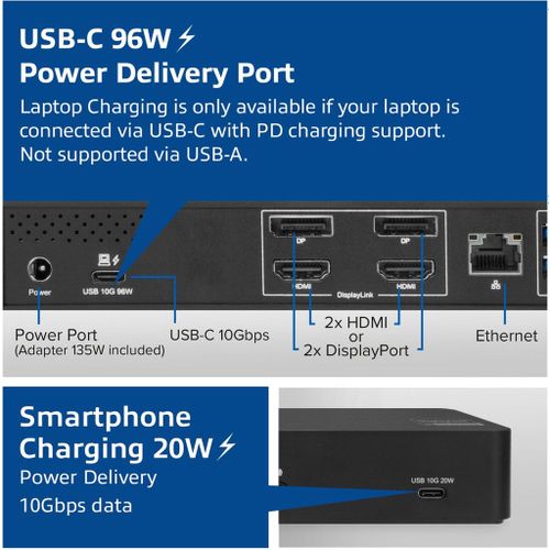 USB-C Docking station | DisplayLink | 2x 4K monitoren | HDMI | DisplayPort | 135W stroomadapter | 96W PD laden | 1x USB-C 10Gbps PD 20W | 4x USB-A 5Gbps | LAN | Audio | USB-C naar USB-A adapter