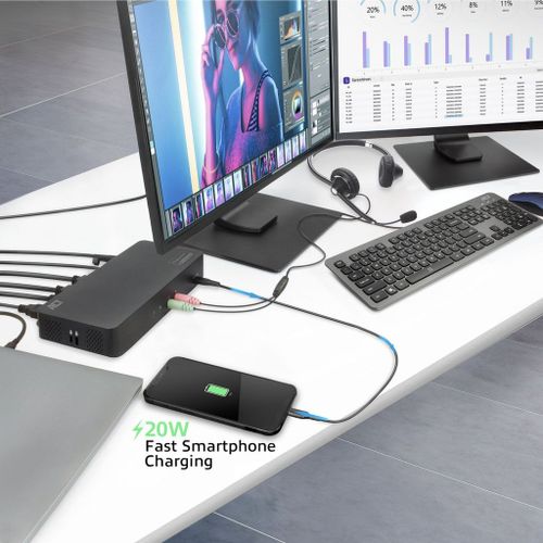 Extra functies Met de aan/uit-knop zet je het dockingstation en alle aangesloten apparaten in een keer aan of uit. De USB-A-poorten zijn allemaal USB 3.2 Gen1 datapoorten, met een maximale dataoverdrachtssnelheid van 5Gbps, voor het aansluiten van je muis of toetsenbord. De USB-C-poort is een USB 3.2 Gen2 poort met een dataoverdrachtssnelheid van 10Gbps. Ook levert deze poort 20W voor het snel opladen van je smartphone of tablet. Sluit een microfoon en hoofdtelefoon aan op de 3,5mm audioaansluitingen.