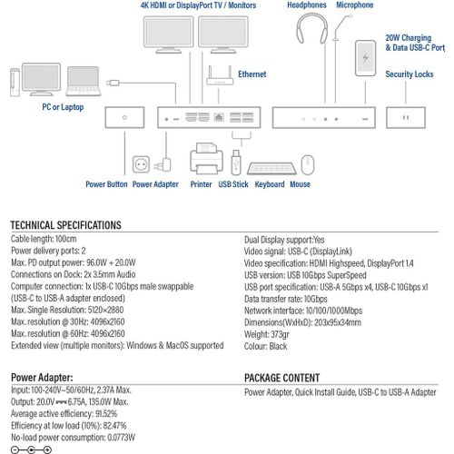 - Stroomadapter (135 W) voor het aansluiten van het dockingstation en het opladen van de USB-C laptop (max. 96W) via de meegeleverde USB-C-kabel