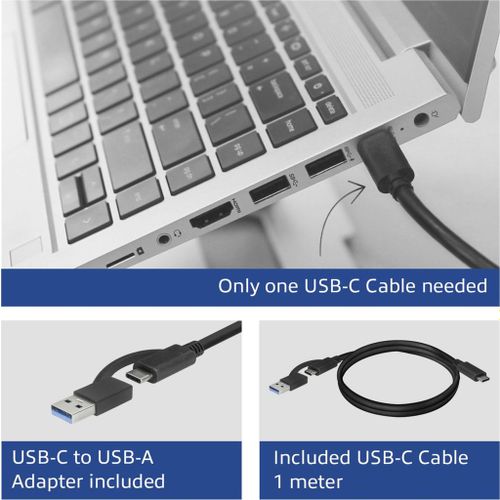 - Afneembare USB-C aansluitkabel (1m) met USB-C naar USB-A adapter