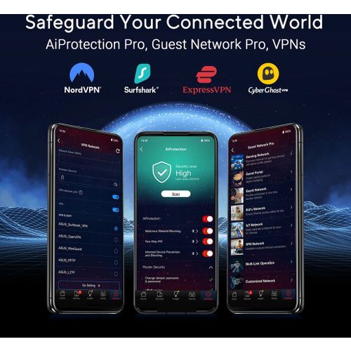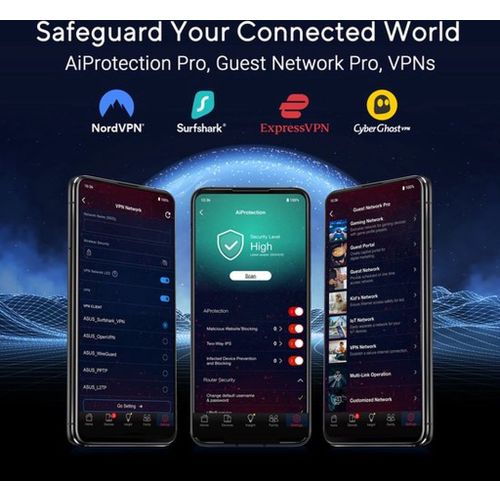 De GT-BE19000 is uitgerust met ASUS RangeBoost Plus, innovatieve RF-technologie en een op gamers afgestemd ruimtethema. Aangedreven door een quad-core 2.6GHz CPU, geavanceerde wifi-chipset en 2GB RAM, kan deze router zelfs de zwaarste gaming- en netwerkuitdagingen aan, zoals 10G-netwerken en AI-geoptimaliseerde prestaties.