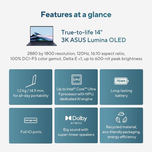 Nieuwe Zen met AI Ga een stap verder met de opvallend slanke Zenbook 14 OLED - de ultieme, ultradraagbare laptop die verfijning naar een heel nieuw niveau tilt. Geniet van elk moment met behulp van de verbeterde accu met langere gebruiksduur, versterk uw efficiëntie met de eersteklas Intel® Core™ Ul...