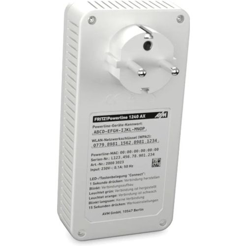 De FRITZ!Powerline 1240 AX wordt gewoon in het stopcontact gestoken en de meegeleverde FRITZ!Powerline 1210 wordt via een LAN-kabel met de FRITZ!Box verbonden. Opvallend hierbij is de individuele codering af-fabriek: de FRITZ!Powerline 1240 AX WLAN-set wordt meteen automatisch veilig in het thuisnetwerk geïntegreerd met 128-bit AES-codering en is meteen klaar voor gebruik. Met maximale veiligheid dankzij WPA2-codering, eenvoudige aansluiting van WLAN-apparaten via WPS (WiFi Protected Setup ) en de krachtige WiFi 6 biedt de FRITZ!Powerline 1240 AX WLAN Set maximaal comfort en flexibiliteit bij draadloos surfen.