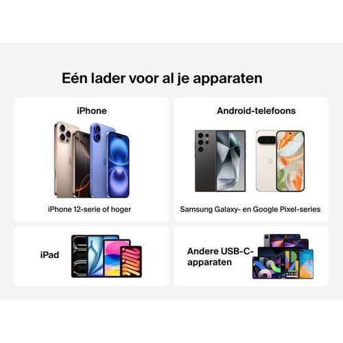 Geschikt voor smartphones en tablets met USB C aansluiting. Werkt probleemloos met onder andere iPhone, Samsung Galaxy en andere Android apparaten die USB C Power Delivery ondersteunen.