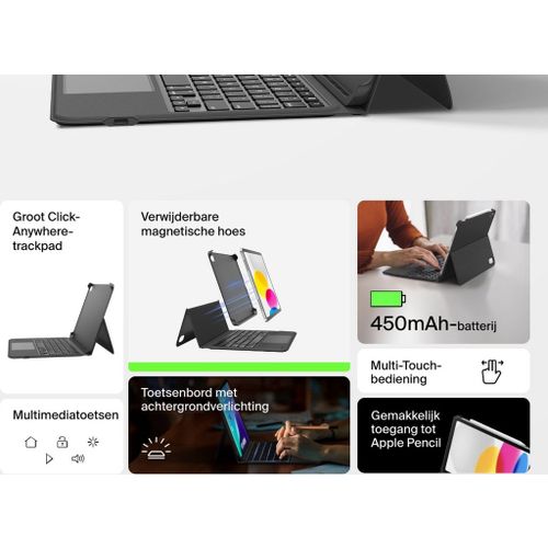 De krachtige 450mAh-batterij zorgt ervoor dat je het toetsenbord minder vaak hoeft op te laden. Bovendien werkt het toetsenbord onafhankelijk van je iPad, zodat je tabletbatterij niet onnodig wordt belast.