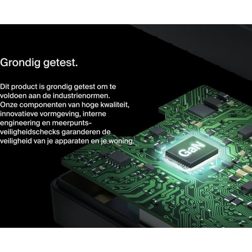 · GaN-technologie: Maakt de adapter kleiner en energiezuiniger zonder in te boeten aan vermogen.