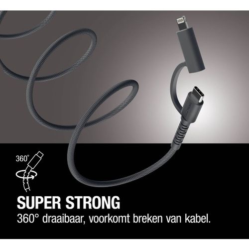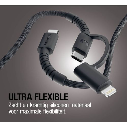 De FlexWave USB-C naar USB-C & Lightning kabel is dé oplaadoplossing voor iedereen die flexibiliteit en kracht wil combineren. Dankzij de 2-in-1 connector laad je eenvoudig zowel USB-C als Lightning apparaten op met één kabel. Het ultraflexibele siliconen materiaal, de sterke gevlochten buitenkant en de 360° strain relief zorgen voor jarenlang zorgeloos gebruik.