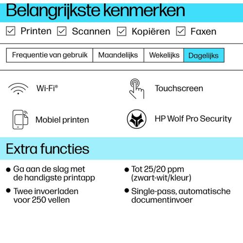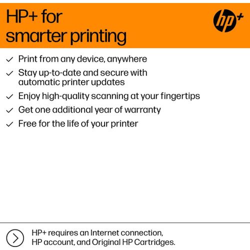 Dit is een printer die HP+ ondersteunt. Kies voor HP+ bij de installatie van het product om jouw voordelen te activeren. HP+ is het slimme printsysteem dat vooruitdenkt zodat jouw printer veiliger, productiever en duurzamer én altijd gebruiksklaar is. Een Cloud verbonden HP+ printer, is slim en blijft up-to-date, beveiligd en altijd gereed om overal te printen. Voor HP+ heb je een HP-account en een continue internetverbinding nodig en moet je gedurende de levensduur van de printer originele HP inkt of toner gebruiken. Na activering is HP+ geïntegreerd in het apparaat en moet je gedurende de levensduur van de printer originele HP inkt of toner gebruiken.