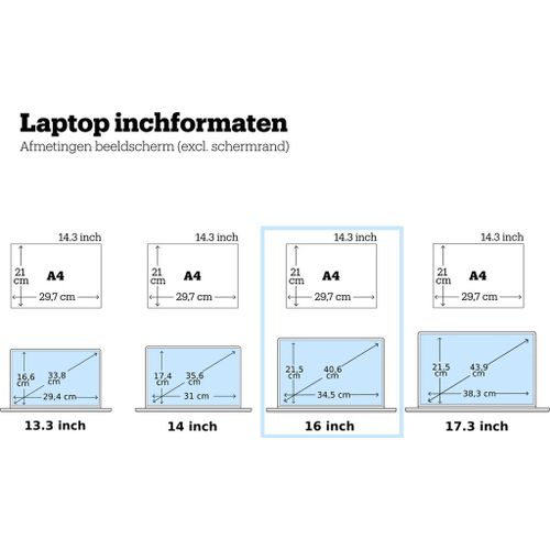 16 inch biedt een perfecte combinatie van standaard en groot formaat. Het scherm is groter en beter zichtbaar dan een 15.6 inch scherm, maar niet zo groot en onhandig als een