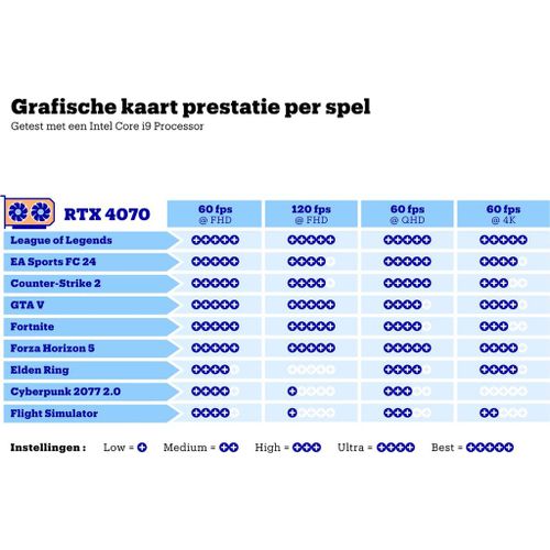 NVIDIA GeForce RTX 4070 beschik jij over een stevige 8 GB aan snel GDDR6 videogeheugen, ruim 4608 vernieuwde CUDA cores en de mogelijkheid om gebruik te maken van de 2e generatie Ray Tracing en DLSS functionaliteit. Game in de hoogst mogelijke instelling in een resolutie van tot wel 4k. Hierdoor zijn jouw game werelden meeslepend.