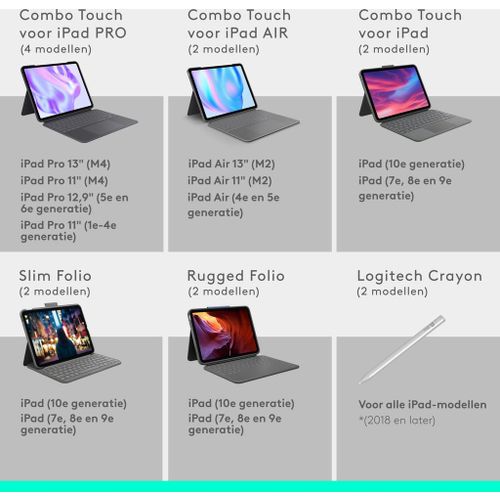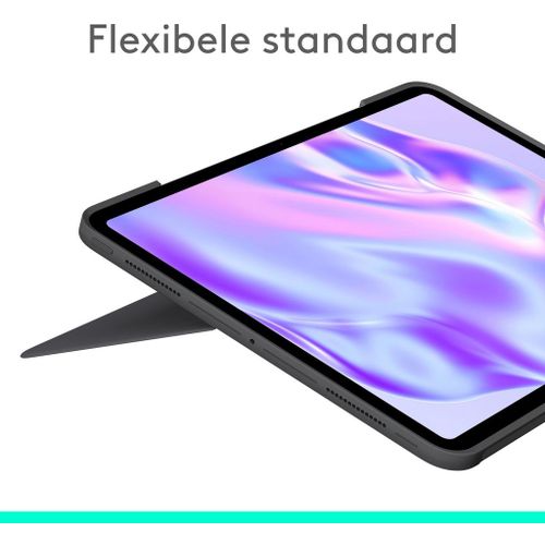 Met de Logitech Combo Touch-tablettoetsenbord wordt je device nog veelzijdiger. Typ, teken, kijk en lees met de Combo Touch-toetsenbordcase. De flexibele standaard en het afneembare toetsenbord van normaal formaat bieden verschillende gebruiksmodi voor elke taak. Haal meer uit je iPad met een grotere trackpad die een superieure, intuïtieve tracking-ervaring biedt met de vertrouwde Multi-touch bewegingen. De dunste Combo Touch tot nu toe is de perfecte metgezel voor onderweg; hij past gemakkelijk in je tas, weegt bijna niets en verbetert je productiviteit overal waar je gaat. De uitzonderlijk robuuste maar toch lichtgewicht case beschermt je iPad tegen slijtage en krassen en de aanpasbare, verlichte toetsen stralen elegant met precieze verlichting, waardoor je sfeervol verlichte werkmomenten nog aangenamer worden. Haal meer uit je iPad met de Combo Touch.