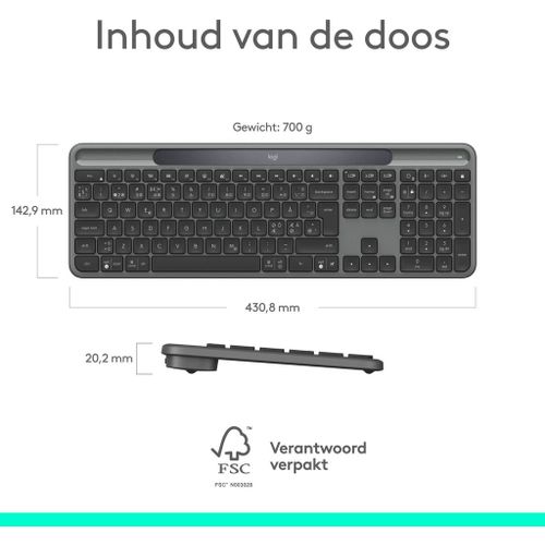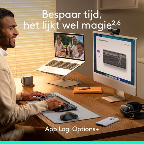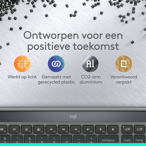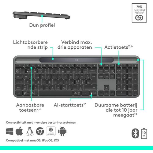 Signature Slim Solar+ is altijd klaar voor gebruik. Dit gestroomlijnde, duurzame draadloze toetsenbord wordt gevoed door zonne-energie en kunstmatige lichtbronnen voor draadloos en probleemloos typen met een vertrouwd laptopgevoel. Met behulp van Logi LightCharge-technologie haalt de lichtabsorberende strip energie uit elke lichtbron en slaat deze tot vier maanden efficiënt op in een duurzame, vervangbare batterij met een levensduur van maximaal 10 jaar. Ontworpen voor jouw minimale, elegante bureauruimte en gemaakt om tot 10 miljoen toetsaanslagen mee te gaan, met hoogwaardige constructiematerialen, waaronder gerecycled plastic: langer beter. Bespaar tijd door repetitieve taken te automatiseren met één toetsaanslag met de actietoets, aanpasbaar met de Logi Options+-app, open je favoriete AI-app met de AI Launch-toets en schakel tussen maximaal drie apparaten met één tik. Koppel hem met een Logitech-muis voor meerdere apparaten om moeiteloos op meerdere computers te typen en te klikken.