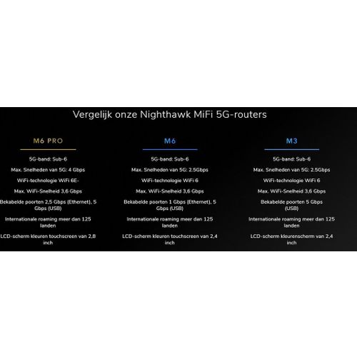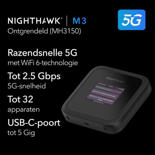 De NETGEAR Nighthawk M3 is een essentiële, simlockvrije 5G MiFi-router met krachtige WiFi-prestaties. Ideaal voor onderweg. De Nighthawk M3 5G MiFi router is simlockvrij, zodat je binnen enkele seconden gebruik kunt maken van de gewenste provider of van switch-providers (abonnement vereist). De Nigh...