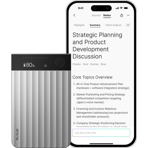 De Plaud Note Pro Silver is een premium dicteerapparaat gecombineerd met krachtige AI‑functionaliteiten. Door zijn slanke, lichtgewicht behuizing biedt het toestel een professionele uitstraling en draagbaarheid, zonder afbreuk te doen aan prestaties.