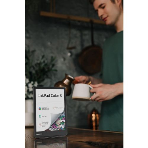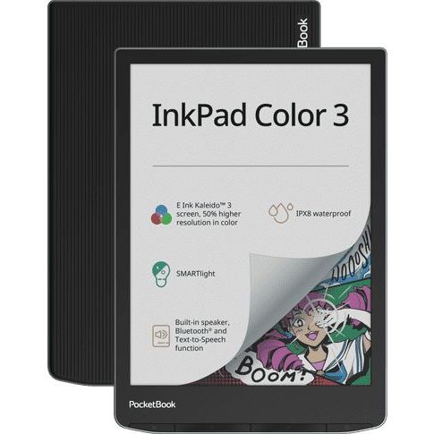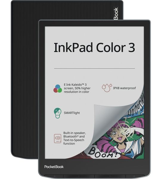 Lees stripboeken of tijdschriften in kleur met de PocketBook InkPad Color 3. De kleuren zijn 50 procent helderder dan zijn voorganger. Je geniet dus nóg meer van levendige kleuren op afbeeldingen, foto's of grafieken. Je neemt deze lichte, middelgrote 7.8 inch e-reader gemakkelijk mee onderweg. Je leest veilig in bad of bij het zwembad, want de InkPad Color 3 is waterbestendig. Via SMARTlight stel je de helderheid en kleur van het scherm in. Zo lees je ook buiten en 's avonds. Je bedient de e-reader met het touchscreen of de knoppen aan de onderkant. Luister je liever naar audioboeken of podcasts? Verbind dan je draadloze oordopjes of koptelefoon via bluetooth met je e-reader. Je krijgt geen oplader meegeleverd. Bestel 'm erbij en laad je e-reader direct op via het stopcontact.