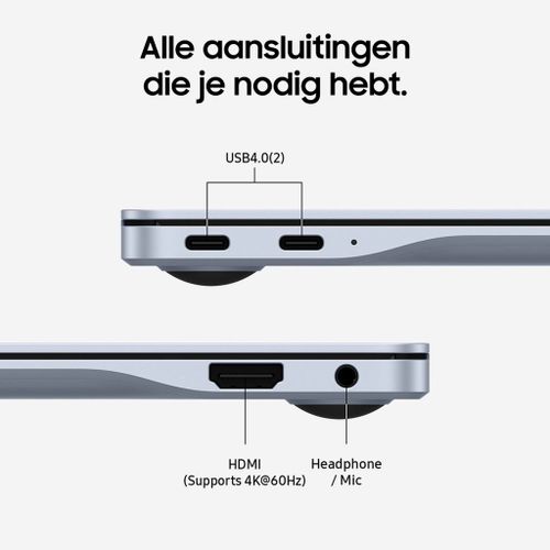 Dankzij de veelzijdige ingebouwde poorten kun je op je Galaxy Book4 Edge 14” moeiteloos en zonder dongel meerdere apparaten aansluiten. Ervaar de razendsnelle gegevensoverdracht van de twee USB 4.0-poorten en sluit gemakkelijk andere apparaten aan met behulp van HDMI 2.1 (ondersteunt 4K bij 60 Hz) en koptelefoon/microfoon.