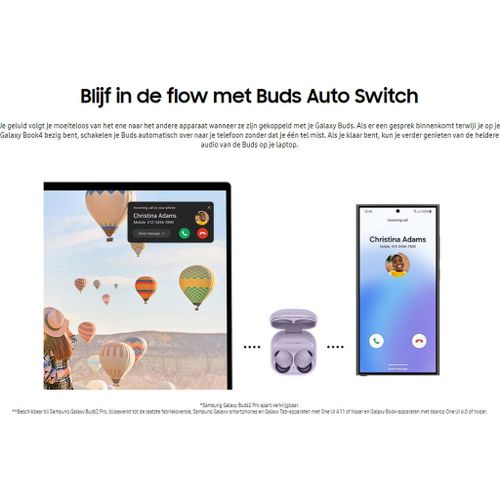 Je geluid volgt je moeiteloos van het ene naar het andere apparaat wanneer ze zijn gekoppeld met je Galaxy Buds. Als er een gesprek binnenkomt terwijl je op je Galaxy Book4 bezig bent, schakelen je Buds automatisch over naar je telefoon zonder dat je één tel mist. Als je klaar bent, kun je verder genieten van de heldere audio van de Buds op je laptop.