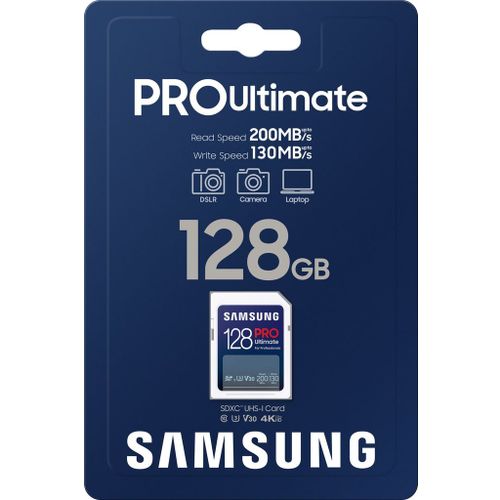 Samsung SD Pro Ultimate 128GB Geoptimaliseerd voor creativiteitOptimaliseer je creatieve workflow met razendsnelle prestaties. De Samsung PRO Ultimate UHS-I SD-kaart biedt uitzonderlijke stabiliteit, krachtige efficiëntie en betrouwbaarheid en voldoet aan de wensen van zelfs de meest veeleisende pr...