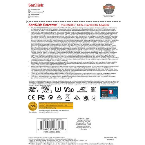 Met de Sandisk Extreme MicroSDXC - 256Gb heb je extreme opslag in een klein kaartje. Deze 2022 uitvoering heeft een nog sneller lees- en schrijfsnelheid voor de beste gegevensopslag voor Camera, Drone, GoPro, de Nintendo Switch en meer!
