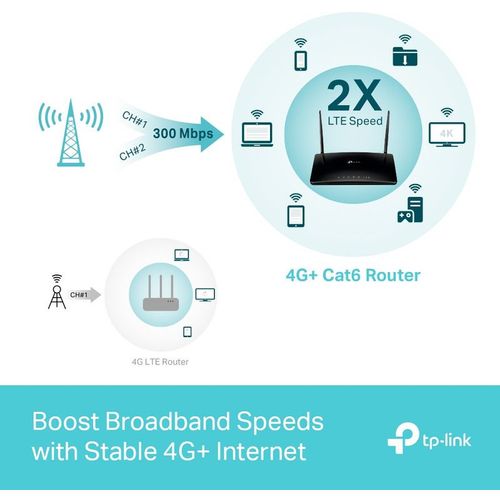 De TP-Link Archer MR500 is een 4G router voor thuis. Met deze router zorg je ook voor een snelle internetverbinding op plekken waar geen vaste lijn aanwezig is. Bijvoorbeeld in het buitengebied, in een vakantiehuis of een pop-up store. Je plaatst hiervoor een simkaart met data abonnement in de router. Hiermee zet je een internetverbinding van maximaal 300 Mbps op. Voldoende om te streamen, online te werken en te surfen. Via wifi of een van de netwerkverbinding deel je dit internetsignaal met maximaal 64 andere apparaten.