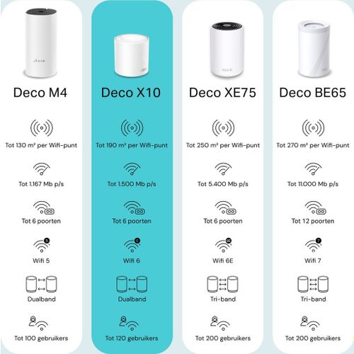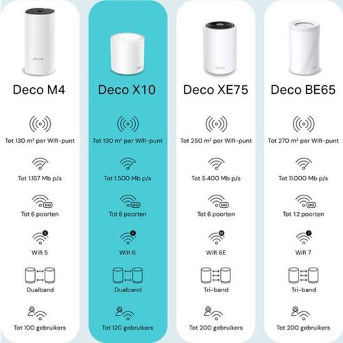 | Aanvullende functies | Spraakbesturing: Gebruik een apparaat met Amazon Alexa of Google Assistant om de Deco X10 met je stem te bedienen. Alle Deco's werken samen: Deco X10 is compatibel met andere Deco-modellen om een mesh-netwerk te kunnen vormen. Breid op ieder moment de mesh wifi-dekking uit door meer Deco's toe te voegen. Eenvoudig beheer: Beheer de wifi-instellingen vanuit huis of op afstand via de Deco app. Hiermee kun je de verbonden apparaten bekijken, apparaten voorrang geven en een gastnetwerk instellen. |