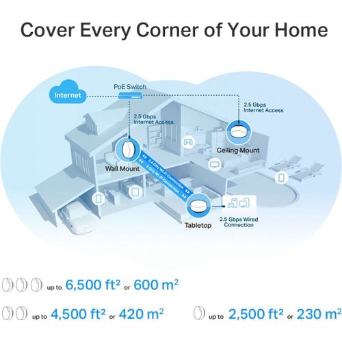 De TP-Link Deco X50-PoE is uitgerust met een 2,5 gigabit ethernet-poort en levert uitzonderlijke multi-gigabit prestaties om te voldoen aan de vraag naar betere en snellere wifi. Breek door de 1G-barrière zodat je apparaten topprestaties kunnen behalen. Of gebruik de 2.5 GbE-poort om te profiteren van razendsnelle bedrade verbindingen. De Deco X50-PoE kan gebruikt worden met slechts één ethernetkabel voor de overdracht van zowel data als stroom. Hij biedt ook ondersteuning voor een DC-voeding (inclusief voedingsadapter) om een flexibele installatie mogelijk te maken. Het Deco whole home mesh wifi-systeem is uitgerust met wifi 6-technologie voor een aanzienlijk betere dekking, snelheid en totale capaciteit. Stap over op mesh wifi-technologie en geniet van het netwerk van de toekomst dat sneller laadt en waarmee meer apparaten verbinding kunnen maken.