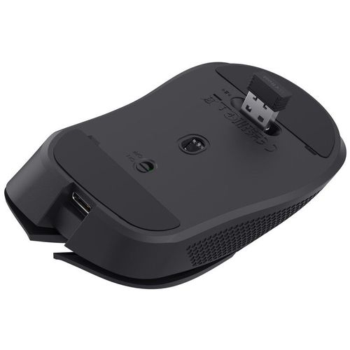 Let op: de USB dongle zit onder het klepje aan de onderkant van de muis.